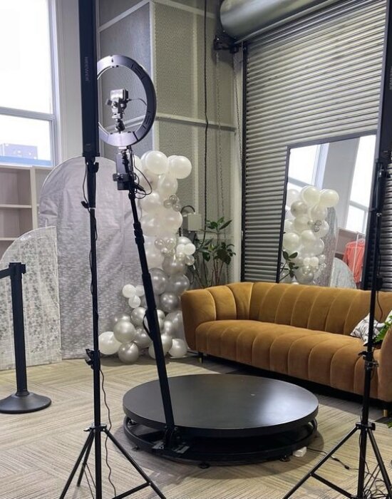 Il s’agit d’un bras équipé d’une caméra et d’un éclairage LED arrondi appelé ring led. Ce bras permet à la caméra de tourner autour d’un plateau sur lequel les participants vous s’installer pour être filmé à 360°. Le plateau est fixe, seule la caméra tourne autour pour un effet 360°. Cela offre une vision de l’arrière plan à 360° également.